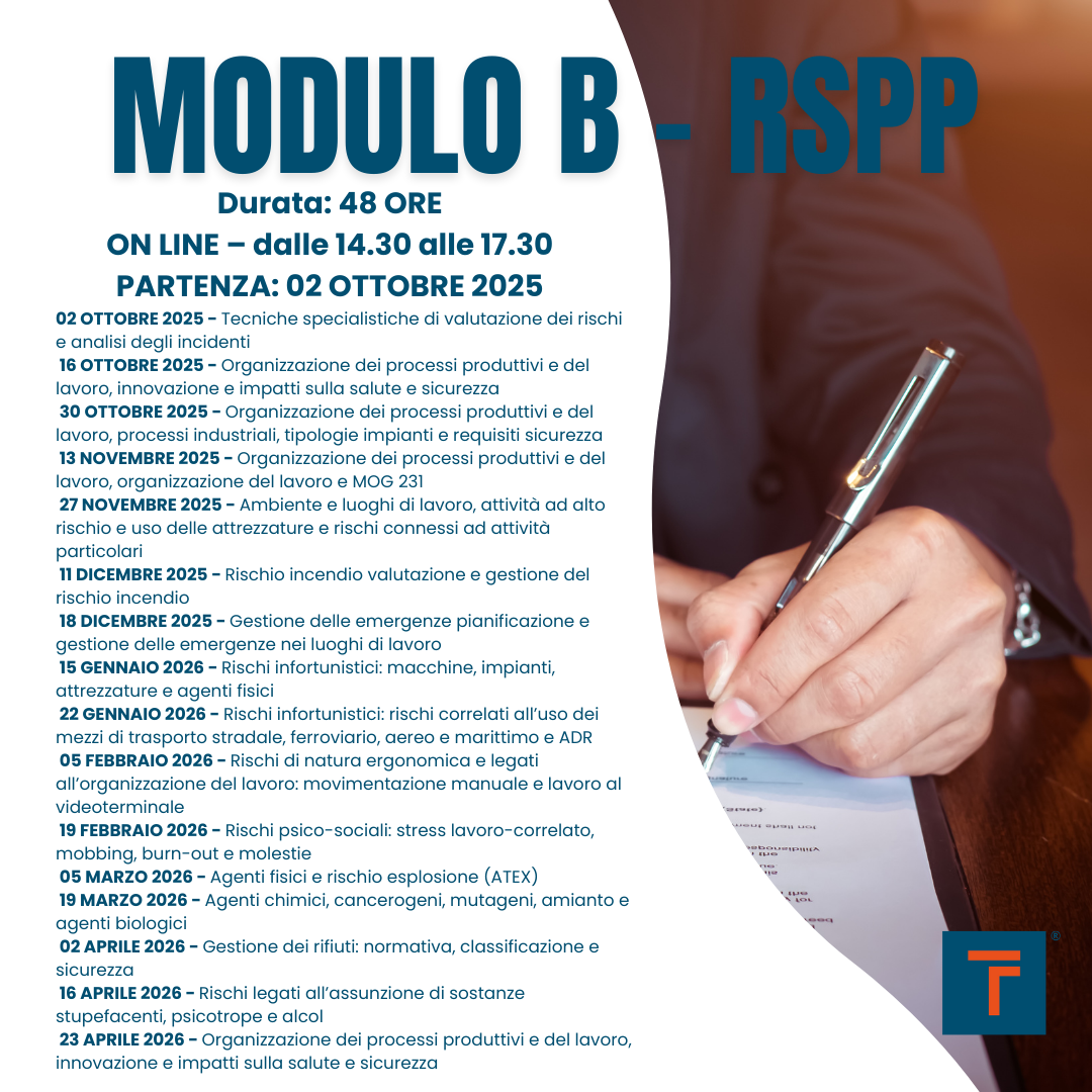 Il Modulo B – RSPP, della durata complessiva di 48 ore, si svolgerà interamente online in sessioni pomeridiane dalle 14.30 alle 17.30, con partenza il 2 ottobre 2025.